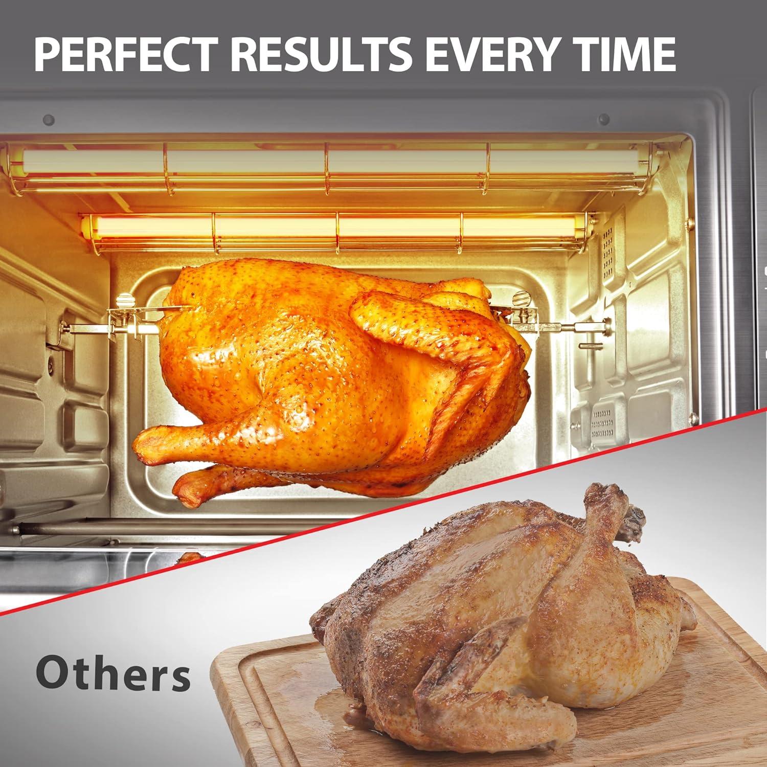 XL FAMILY-SIZED CAPACITY – With a Larger interior, this oven can fit up to 6 slices of bread, a 11″ pizza, casseroles, cookies, and up to a 4-pound chicken. External Dimensions are approximately 18. 98″ X 15. 59″ X 10. 78″