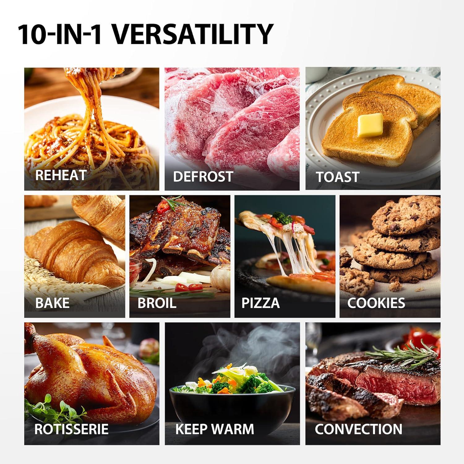 10-IN-ONE VERSATILITY – With 10 Functions, this All-in-One machine can take care of all your cooking needs. 10 Functions include: Toast, Bake, Broil, Pizza, Cookies, Defrost, Reheat, Rotisserie, Keep Warm, and Convection.ONE-YEAR LONG WARRANTY – 1-Year Warranty Plus a Lifetime of Customer Support. Any problems with your toaster oven will be solved professionallyHolds six slices of bread, or fits 12 inch pizza Convection fan for even and faster cooking