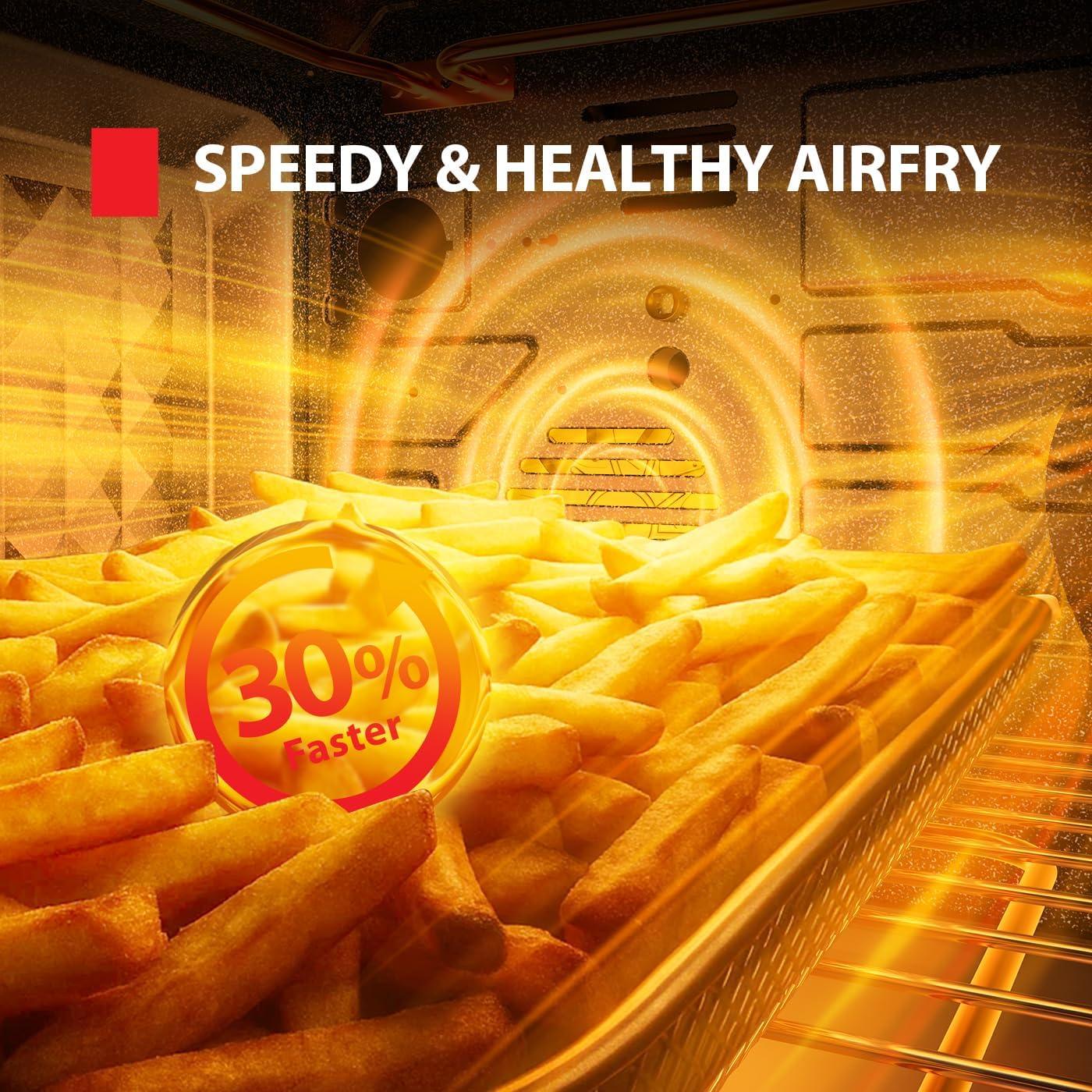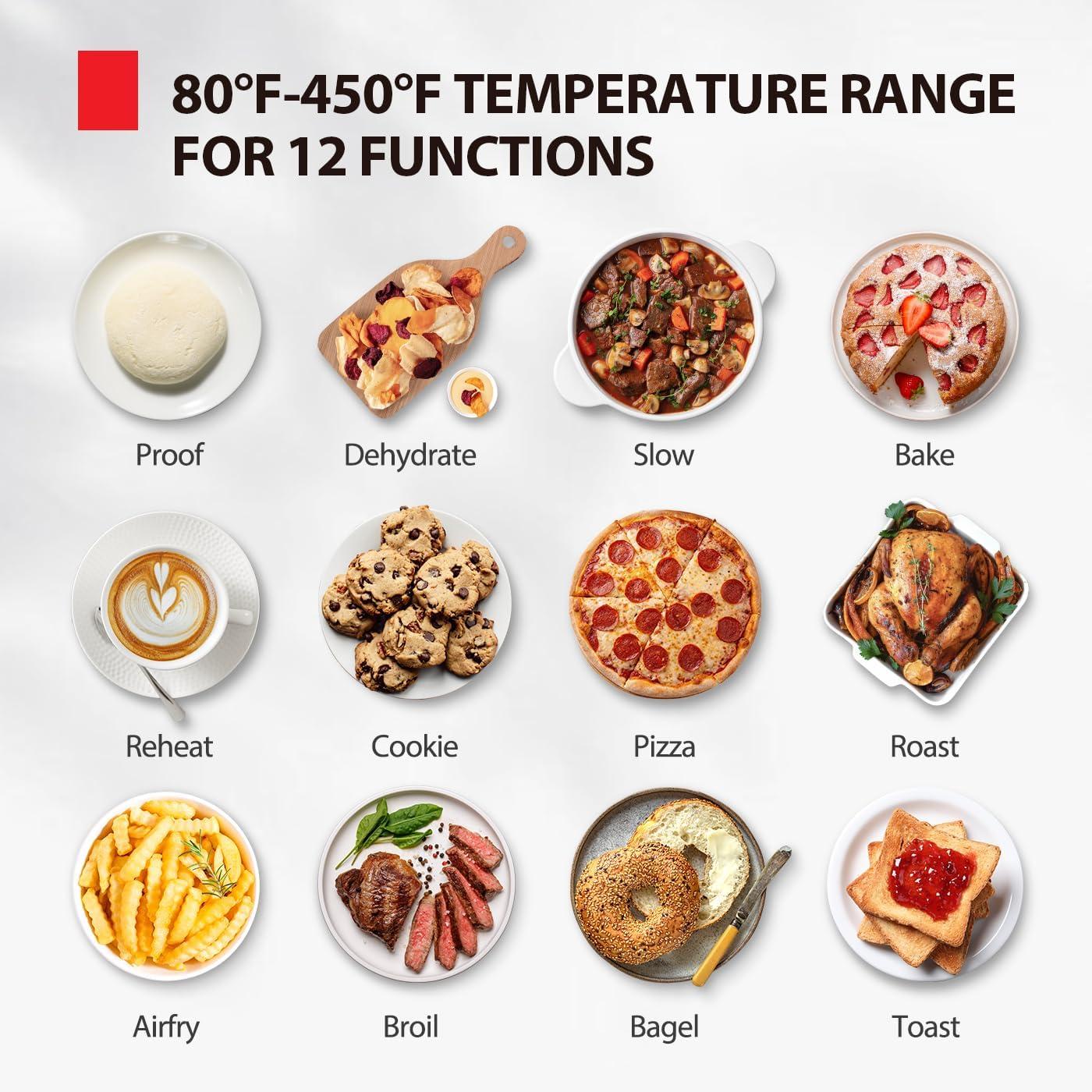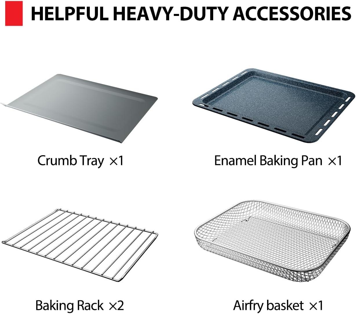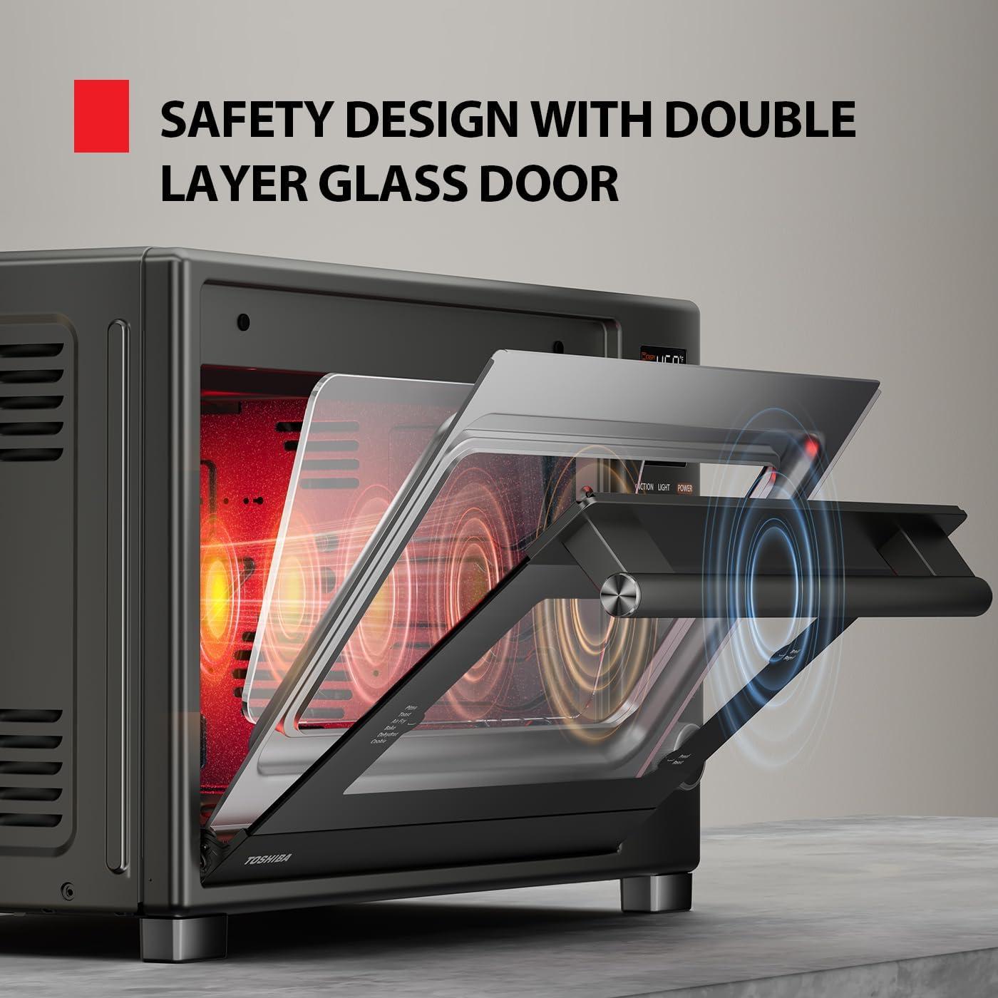 Upgrade your culinary space with the TOSHIBA ChefFry 34QT Air Fryer Toaster Oven Combo, a 12-in-1 convection countertop oven. This stainless steel powerhouse combines a family-sized 32L capacity with Turbo Cyclone Fans for perfectly even cooking, handling everything from a 10-pound chicken to two 13-inch pizzas. Its exclusive Pizza Mode ensures a crisp crust and caramelized toppings, while 12 versatile functions—from proofing dough to air-frying—offer endless possibilities. A cool-touch luxury door enhances safety, and the scratch-resistant enamel interior makes cleanup effortless. ChefFry FAQ: **1. About the Capacity and Even Cooking** With powerful Turbo Cyclone Fans and precision heating, the 34QT (32L) cavity delivers even results without rotating trays. It easily accommodates large items like a 10-pound chicken or two 13-inch pizzas, eliminating cold spots for consistent cooking. **2. About Pizza Mode** Our exclusive Dual-Temp Tech simultaneously crisps the crust from below and caramelizes toppings from above. This prevents soggy centers and burnt edges, delivering pizzeria-quality slices every time. **3. How to use the 12 Cooking Modes** The 12-in-1 functionality covers all culinary needs: – **Gentle Heating (80°F):** Use Slow or Proof modes for dough. – **High-Heat Cooking (up to 450°F):** Use Air Fry, Bake, Roast, Broil, or Pizza for crispy results. – **Convenience Functions:** Reheat, Dehydrate, Toast, Bagel, and Cookie modes offer specialized settings for various foods. **4. How to clean my oven?** – **Power off and cool:** Always unplug and allow the oven to cool completely. – **Wipe interior:** The scratch-resistant enamel interior can be wiped clean with a soft cloth and warm water—no scrubbing required. – **Clean exterior:** Wipe the stainless steel exterior with a suitable cleaner. The dual-layer glass door can be cleaned with a glass cleaner. – **Dry thoroughly:** Ensure all surfaces are dry before next use. **5. Safety Warning** While the cool-touch door remains significantly cooler, the top exterior may become hot during operation. Avoid direct contact to prevent burns.
