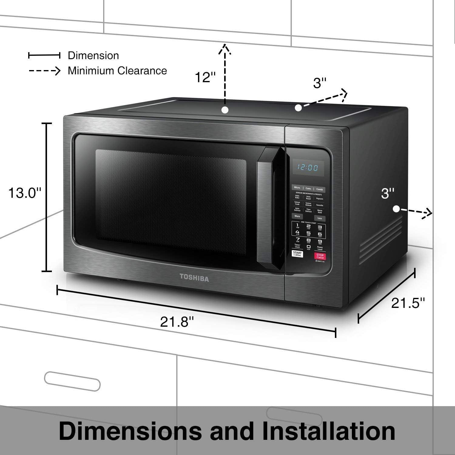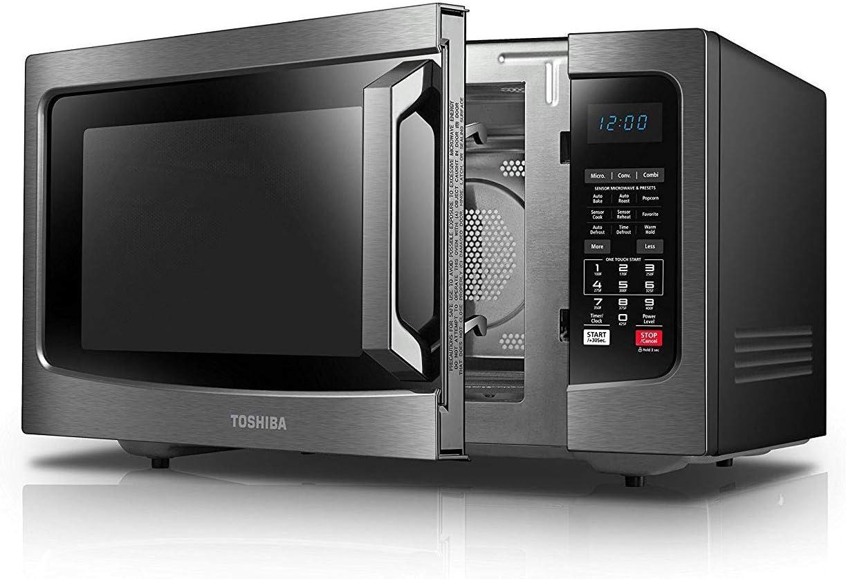 This Toshiba 1.5 cu. Ft. 1000 watts microwave oven with its (black) stainless steel finish and timeless look can match different kitchen styles. It features a convection function with 4 auto bake menus & 4 Auto roast menus, a sensor function with 13 auto menus, one touch popcorn button, easy defrosting by weight/time, microwave cooking with 10 power levels, warm hold function, express cook buttons for 1-6 mines and memory function. It is equipped with a bright LED cavity light, a glass turntable, energy-saving ECO mode, a mute button, a clock and a kitchen timer. The bright LED digital display, easy-to-read control panel and easy-to-grip door handle further improve the user experience. The stainless steel cavity is scratch and rust-resistant and is also easy to clean. For further information please kindly refer to the user manual and cookbook provided as a PDF document below the product description section.