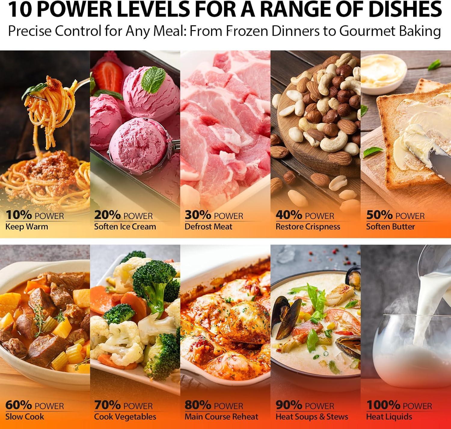 10 Unique Power Levels with clock and kitchen timer: Tailor your cooking power levels for greater culinary flexibility, making it an essential kitchen tool. Perfect for everything from deodorization to boiling liquids.