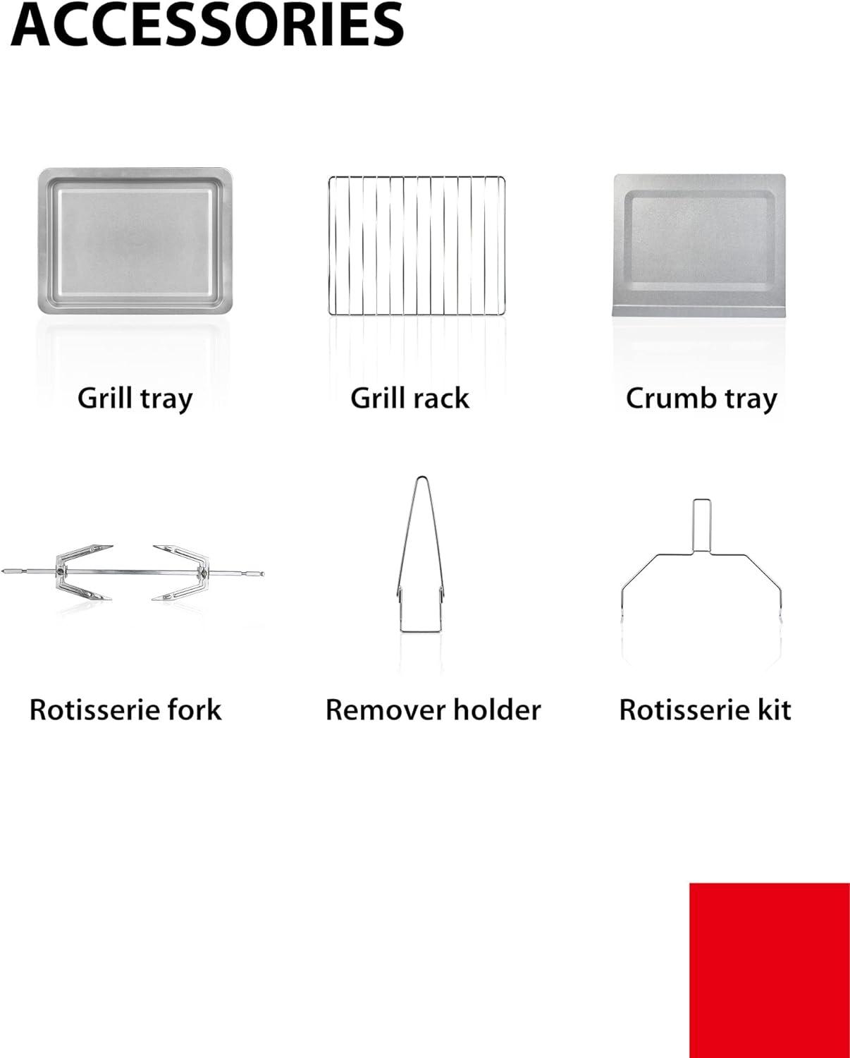Product Specs: External dimension (WxDxH): 19.7″ x 14.96″ x 12.8“, Interior dimension (WxDxH): 14.2″ x 12.6″ x 10.8“, Accessories include: Crumb tray, Baking Tray, Rack, Remover holder, Rotisserie Fork and Rotisserie kit.
