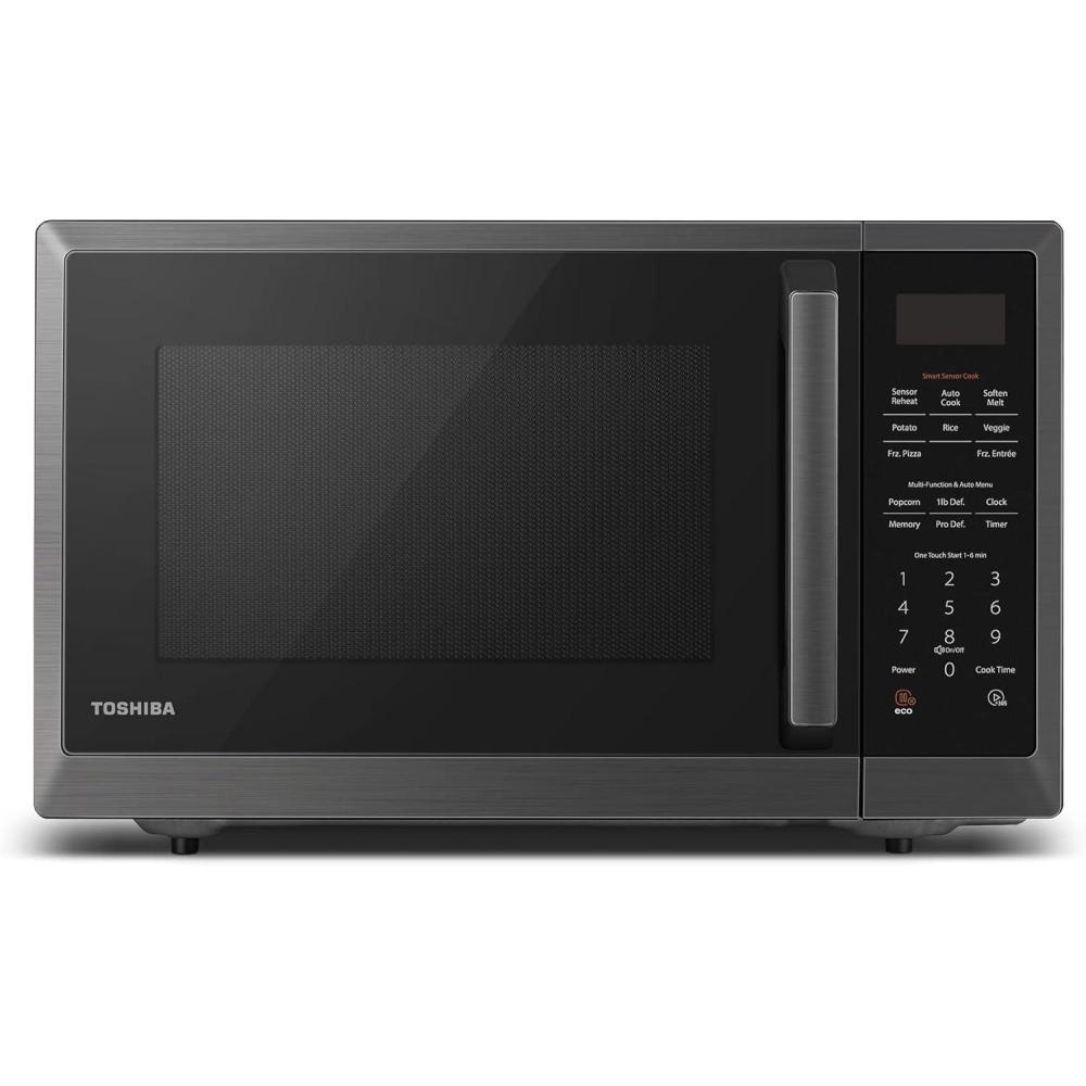 This Toshiba 1.2 Cubic feet 1100-watt Black Stainless Steel microwave is the ideal size for apartment kitchens or office break rooms. Equipped with A 12.4″ turntable can cook a 12″ pizza without pressure. Sensor reheating lets you optimally cook 12 kinds of popular food with intelligent auto menus with the touch of a button. Choose from ten power levels up to 1100 watts. The large digital display has a clock function and can also display a countdown timer as well as the cooking time remaining. Program up to 12 auto menus and power combinations for additional one-touch convenience. Easily open or close the microwave with the large, easy-to-grip door handle; elegant, slim lines and a diamond-cut design fits your modern or contemporary kitchen. Also, the mute function can let you enjoy cooking without disturbing your family or roommates. ECO mode can save energy and has an ultra-low electricity consumption when you are not cooking. Last but not least, the ECO function, 10 power levels, removable turntable, 1lb defrost, memory function, multi-stage cooking, child safety lock, mute function, clock, and kitchen timer can bring you convenience.